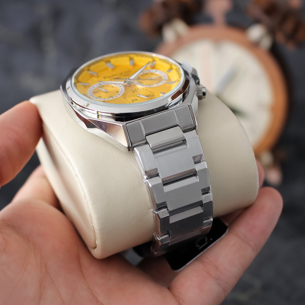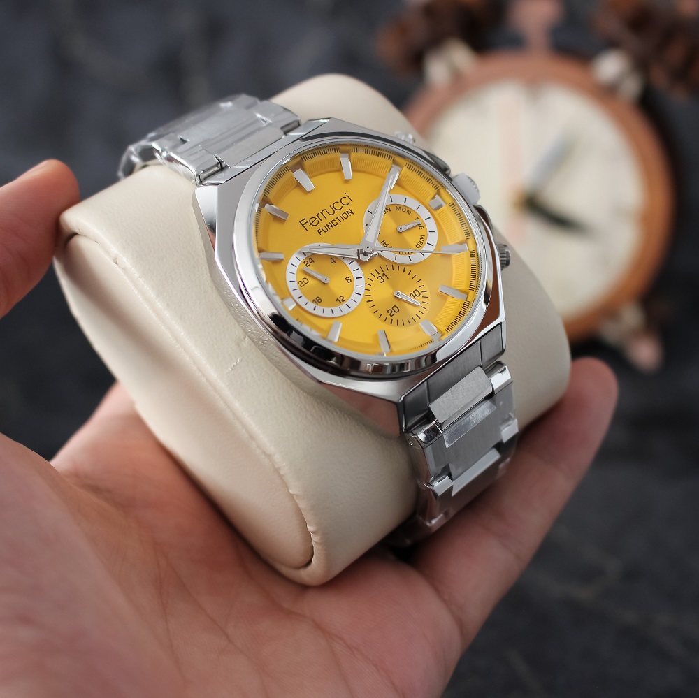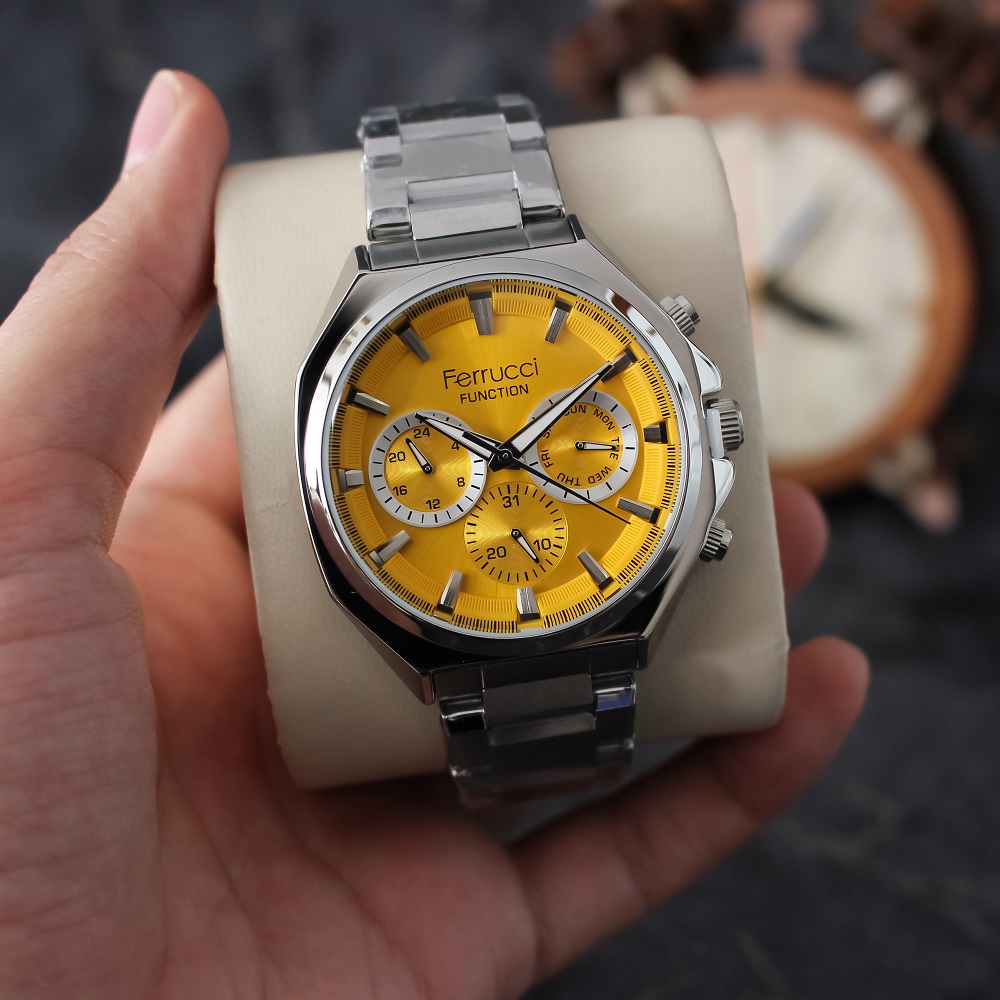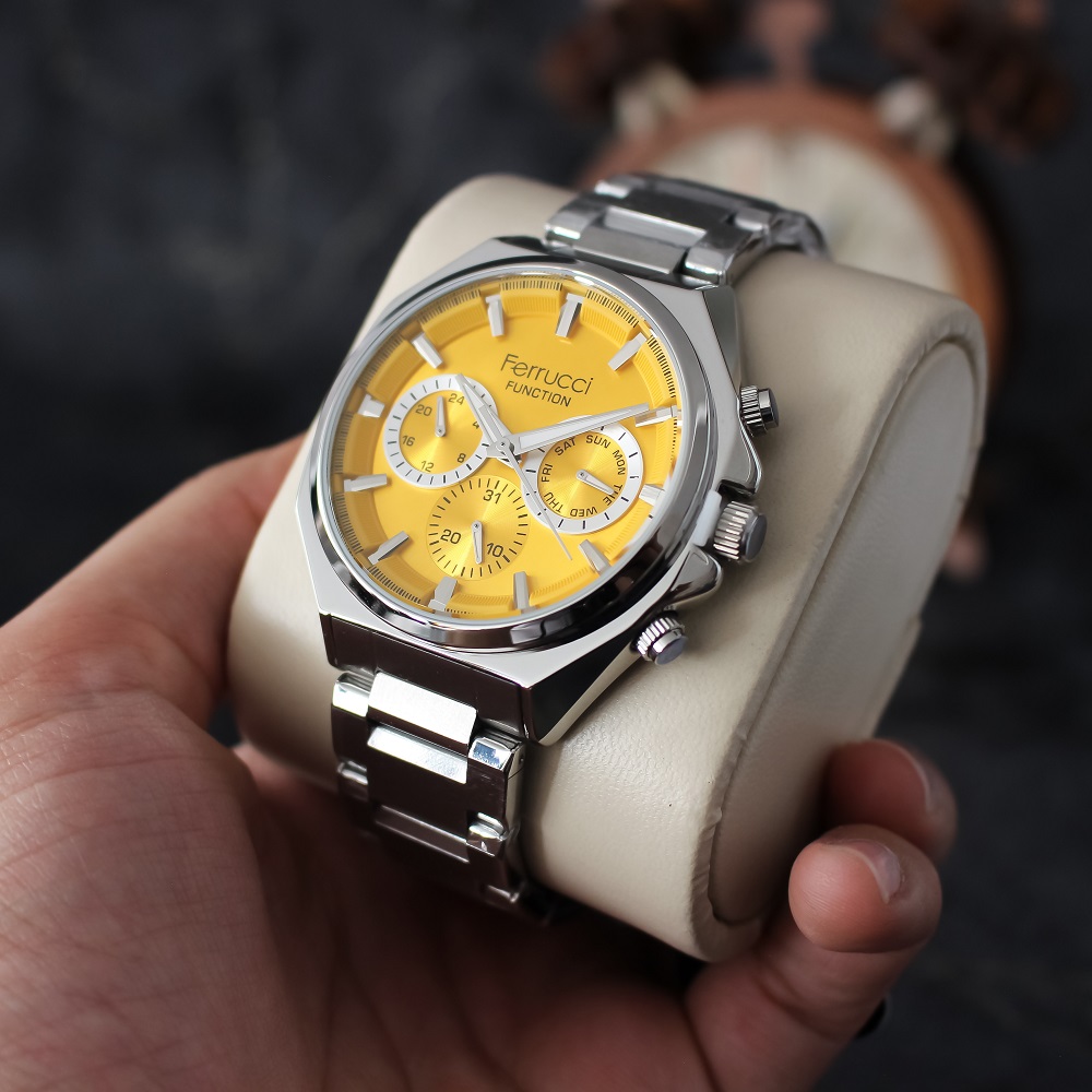 ساعت های برند فروچی از کیفیت و کارایی بالایی برخوردار هستند.این ساعت مردانه اورجینال با رنگ بدنه نقره ای و صفحه زرد نشان دهنده ی سلیقه خاص شما و شیک پوشی شما میباشد و استایل شما رو تکمیل میکند. ساعت های فروچی دارای ضمانت رنگ،موتور و باطری هستند و در صورت تغییر رنگ و ضعف در عملکرد موتور ساعت به راحتی میتوان از گارانتی معتبر شرکت استفاده کرد. انتخاب شما ساعت ارزان میباشد یا ساعت قیمت مناسب با کیفیت بالا ؟این ساعت مردانه اصل هم دارای قیمت اقتصادی نسبت به کیفیت خودش هست و هم دارای کیفیت تضمینی.